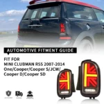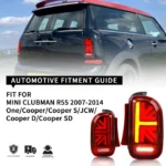 Fitment: Designed specifically for the Mini Clubman R55 models, including One, Cooper, Cooper S, JCW, Cooper D, and Cooper SD from 2007 to 2014. These aftermarket Union Jack rear tail lamps are compatible with both early and later models within this range.