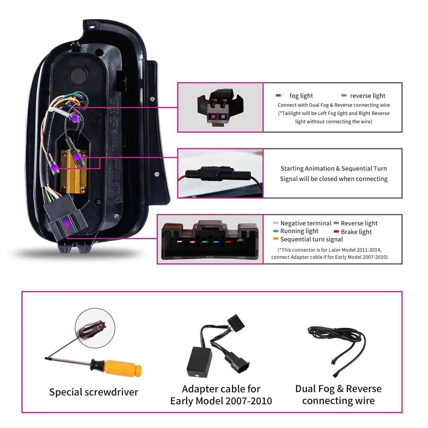 Package Includes: Each package comes with driver side and passenger side LED tail light assemblies, along with a wiring kit